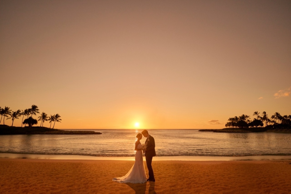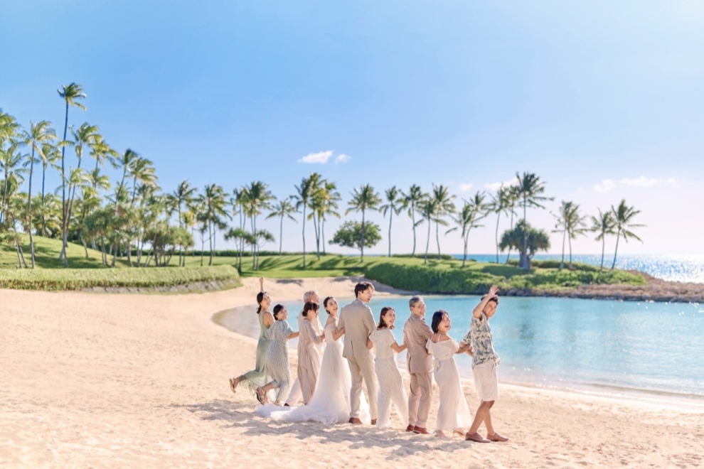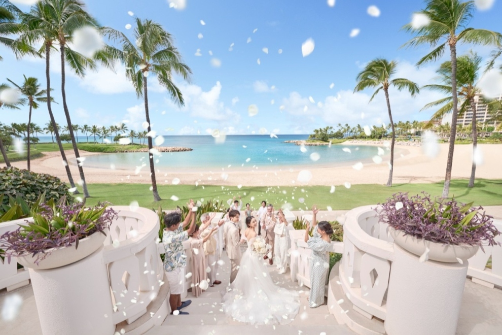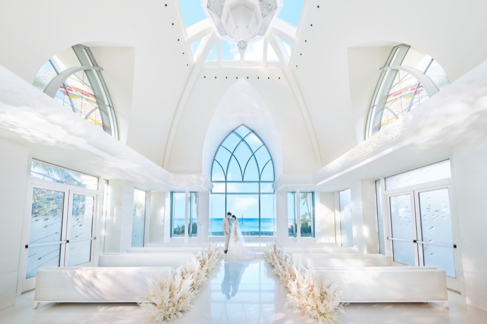 コオリナの美しい海と空を染めるブルーを純白に輝く空間に招き入れたような、息を飲むほどに素晴らしいビーチフロントのまばゆい景色が、ふたりと大切なゲストをお迎えします。